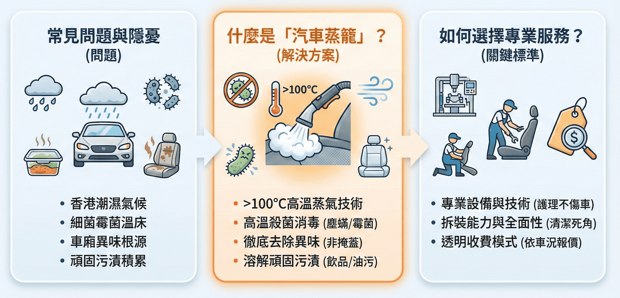- 高溫蒸氣清洗(蒸籠): 重點環節,針對天花、座椅、地台、門板及冷氣風口進行高溫燻蒸。